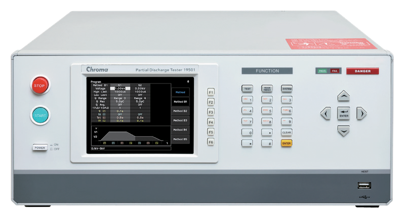 The Chroma 19501-K Partial Discharge Tester is an instrument equipped with AC hipot test and partial discharge detection functions,it is specifically designed for testing high voltage semiconductor components and high insulation materials. In addition, the product design is compliant to the IEC60270-1 standard in particular the partial discharge testing requirements for high voltage and embedded IEC60747-5-5 measuring methods can meet the production test requirements, providing a user-friendly operating interface.